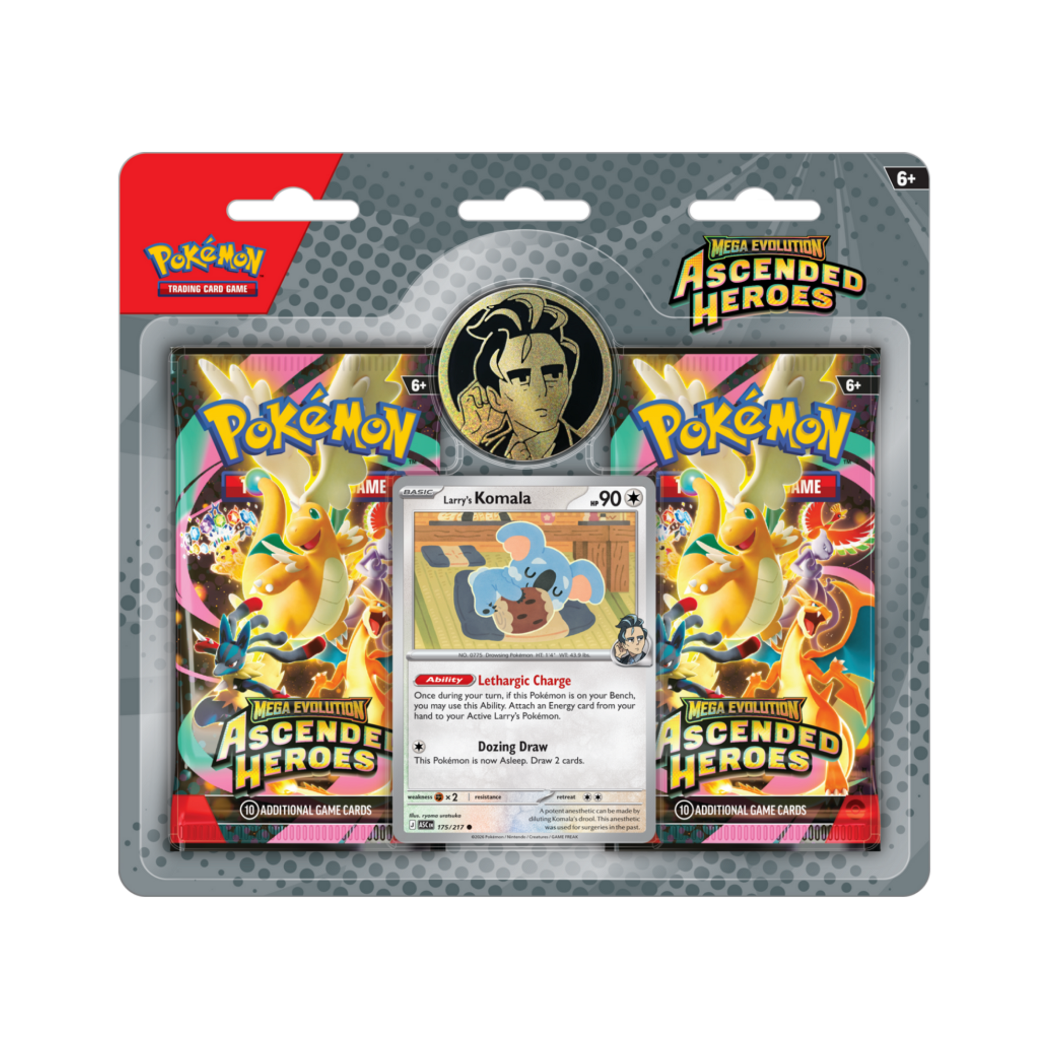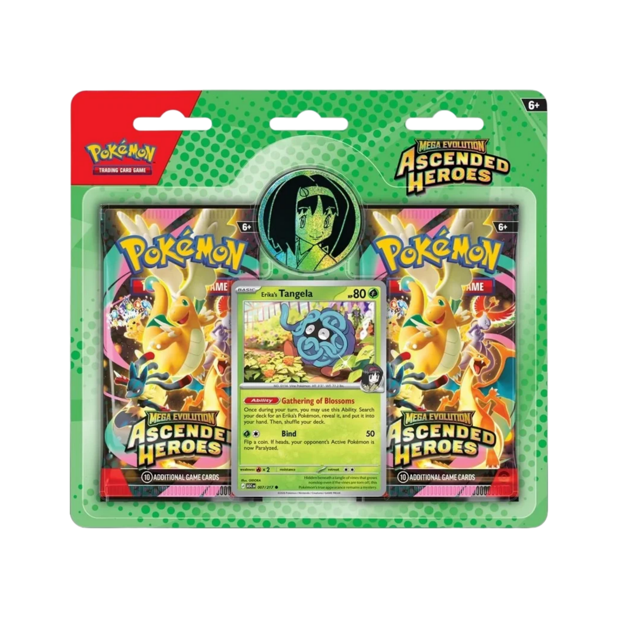 The Celadon City Gym, led by Gym Leader Erika, is filled with beautiful greenery and Grass-type Pokémon galore. Visitors to Medali in the Paldea region have the chance to battle Gym Leader Larry and his Normal-type Pokémon. In this collection, you’ll find a promo card featuring either Erika’s Tangela or Larry’s Komala, a metallic coin featuring your chosen Gym Leader, and two booster packs from the Mega Evolution—Ascended Heroes expansion.
