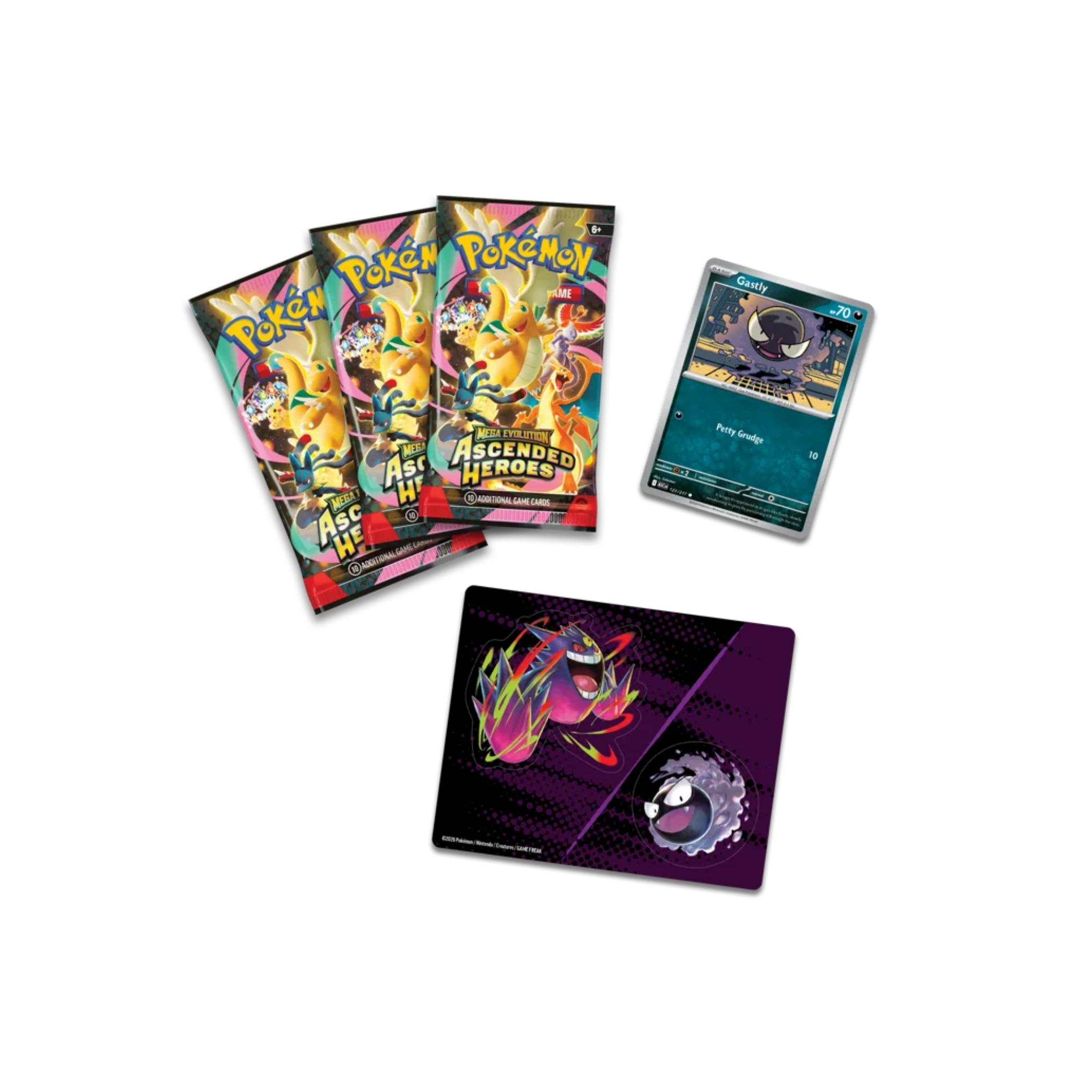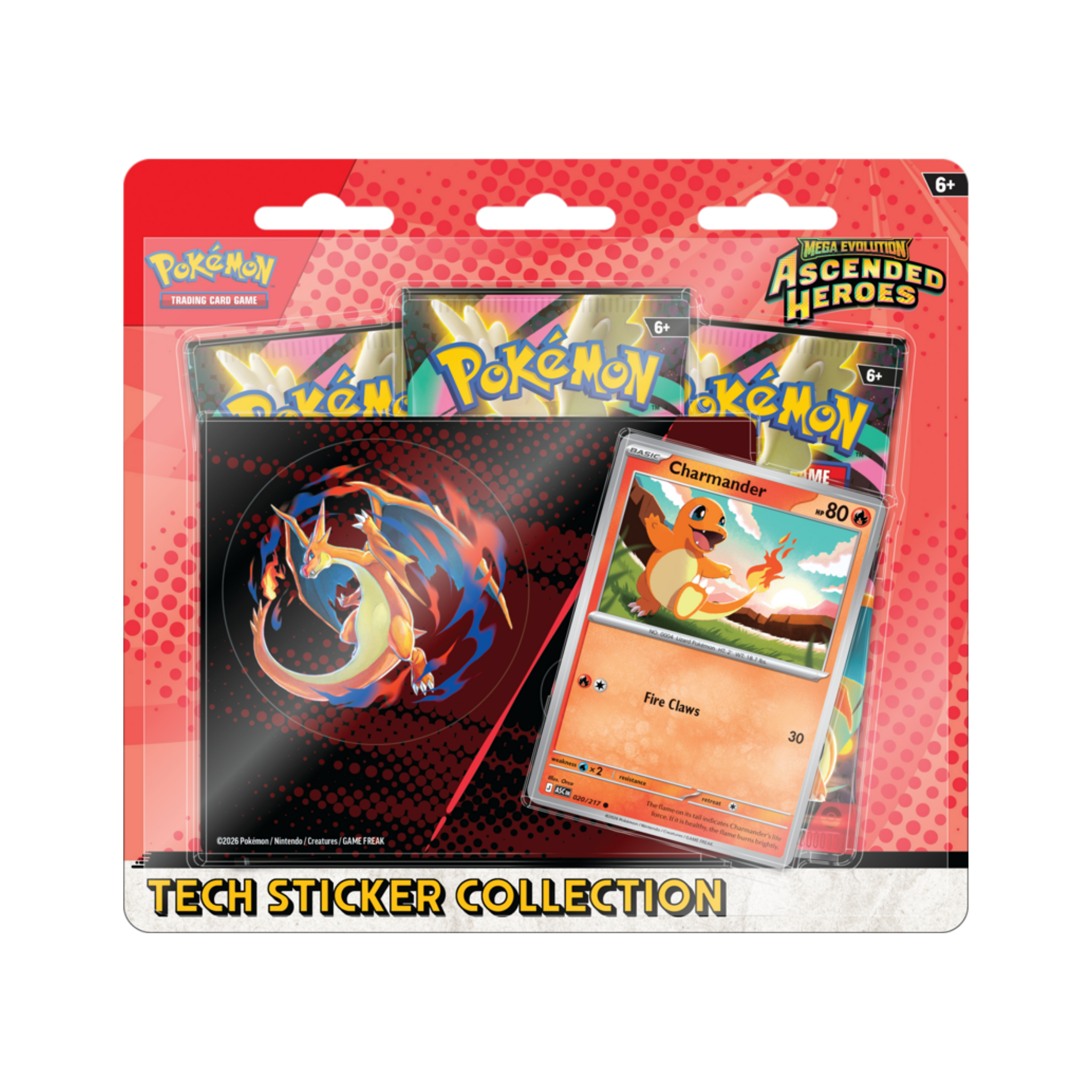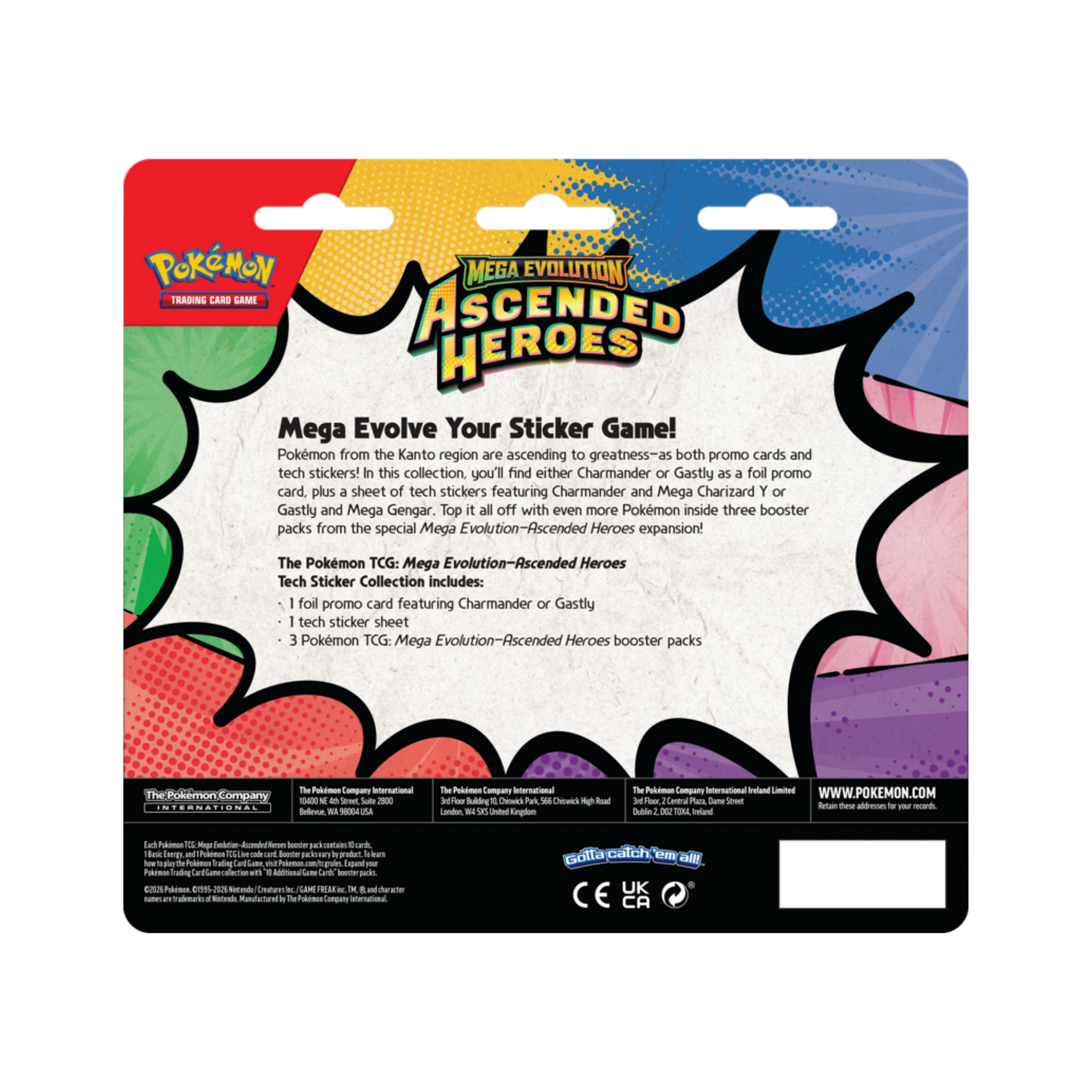 Pokémon from the Kanto region are ascending to greatness—as both promo cards and tech stickers! In this collection, you’ll find either Charmander or Gastly as a foil promo card, plus a sheet of tech stickers featuring Charmander and Mega Charizard Y or Gastly and Mega Gengar. Top it all off with even more Pokémon inside three booster packs from the mega-awesome Mega Evolution—Ascended Heroes expansion.