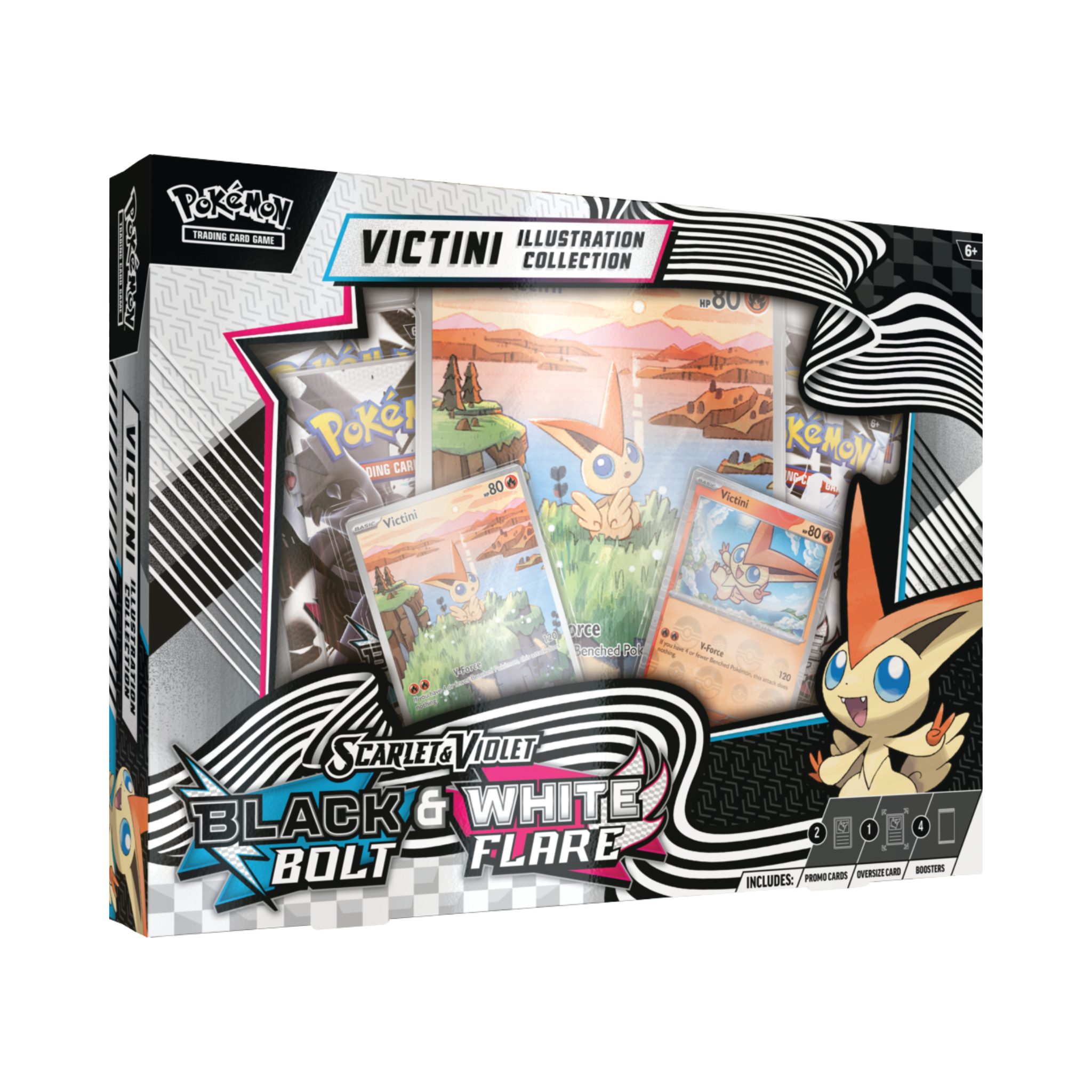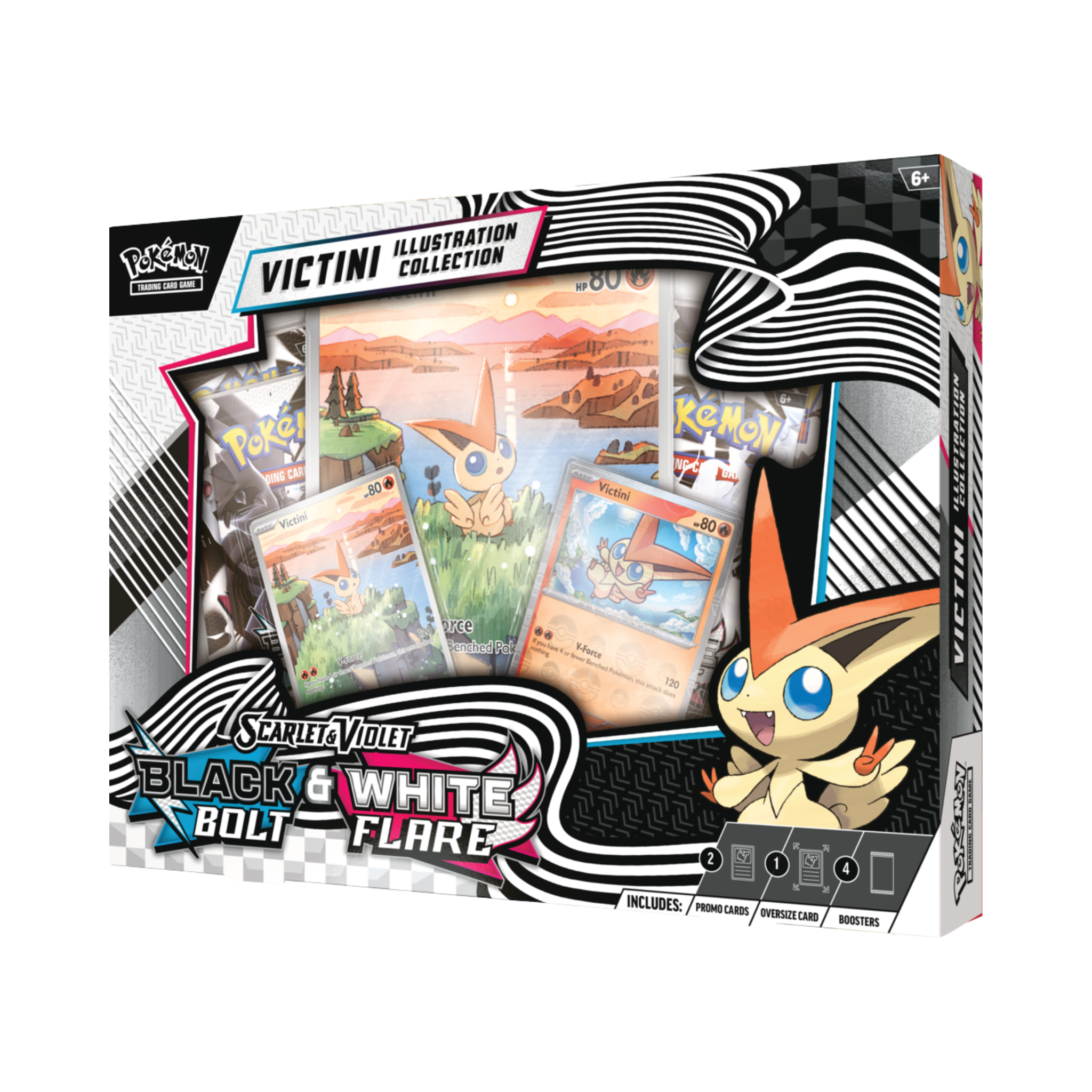 Borrow a Mythical Pokémon’s Power! The Mythical Pokémon Victini is said to create infinite energy that it can share with its friends, and now you can team up with it in your own Pokémon TCG decks! In this collection, you get an illustration rare-style foil promo card and a premium parallel foil card featuring Victini, along with an oversize card for display. You’ll find even more Pokémon from the Unova region inside the included booster packs from the special Scarlet & Violet—Black Bolt and Scarlet & Violet—White Flare expansions.