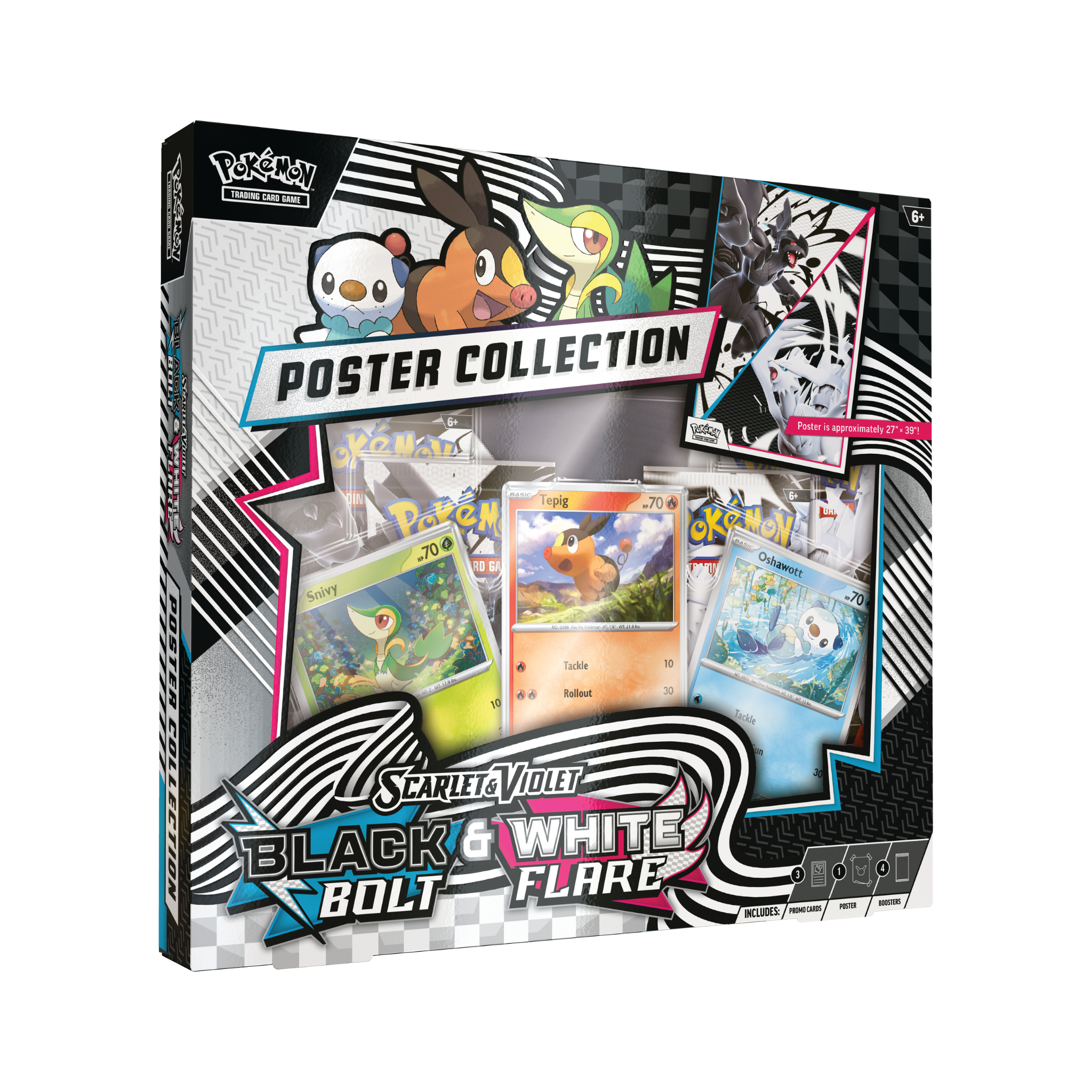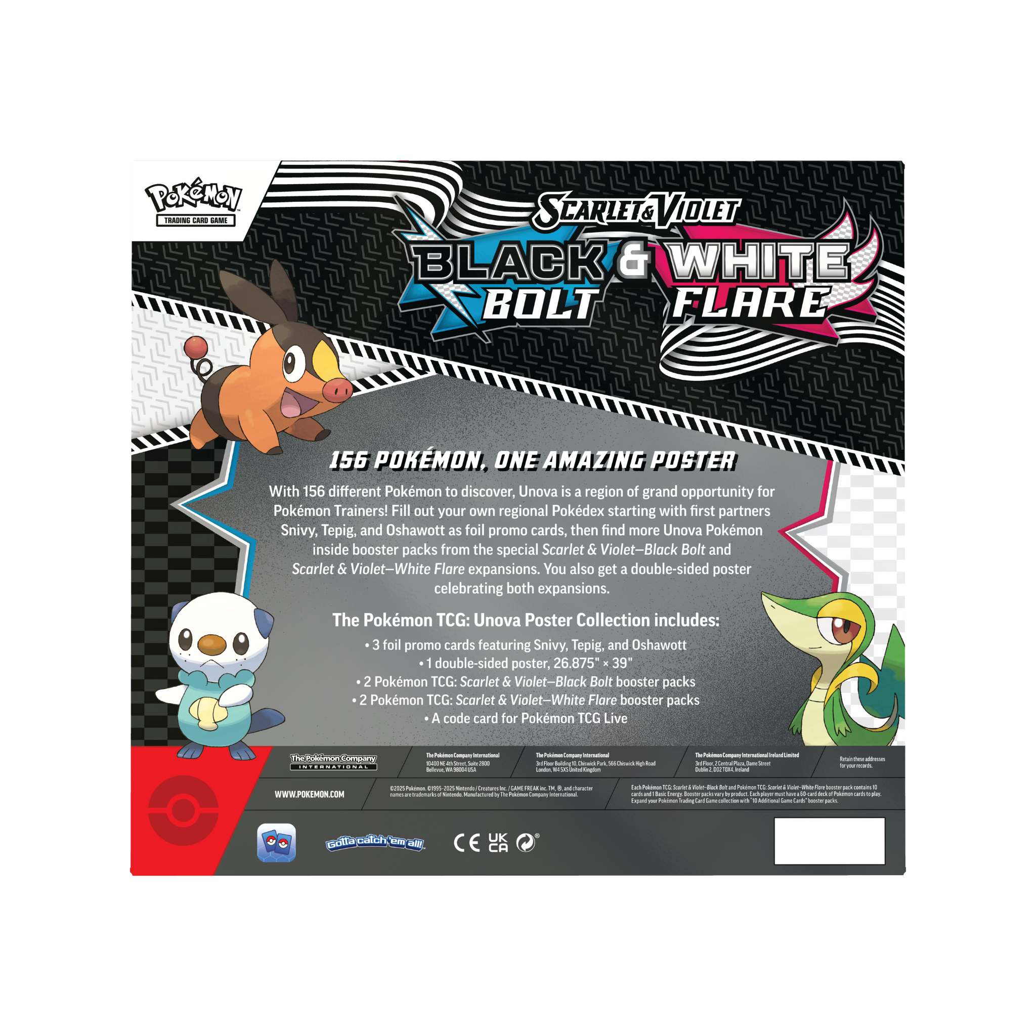 With 156 different Pokémon to discover, Unova is a thrilling region of opportunity for Pokémon Trainers! Fill out your own regional Pokédex starting with first partners Snivy, Tepig, and Oshawott as foil promo cards. From there, find more powerful Unova Pokémon inside booster packs from the special Scarlet & Violet—Black Bolt and Scarlet & Violet—White Flare expansions. You also get a double-sided poster celebrating both expansions.